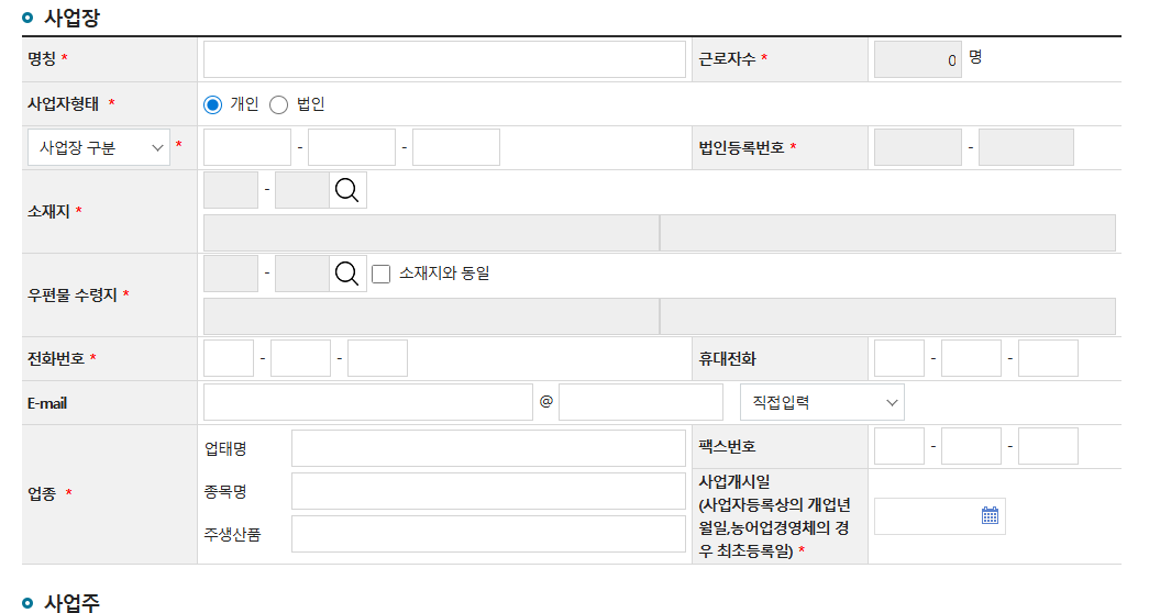 - ‘근로자를 사용하지 않는 사업주’ 체크 (1인 사장인 경우)