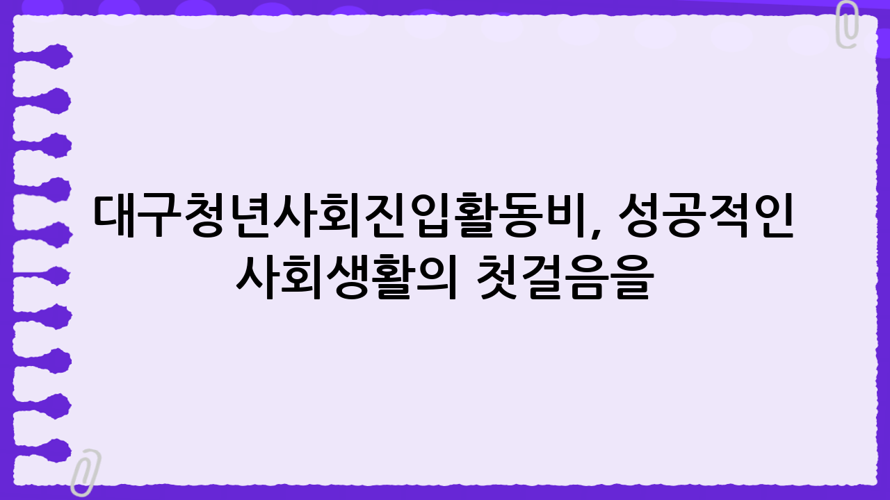 대구청년사회진입활동비는 청년들의 꿈을 응원하고, 성공적인 사회 진출을 돕는 든든한 지원군입니다. 지금 바로 신청하고, 더 나은 미래를 만들어보세요!