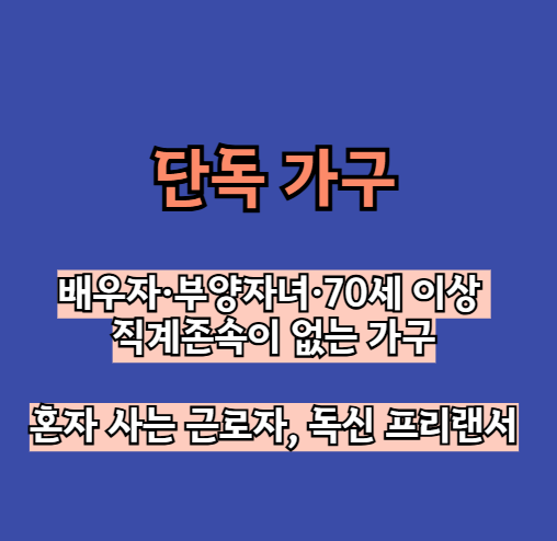 | 단독 가구 | 배우자·부양자녀·70세 이상 직계존속이 없는 가구 | 혼자 사는 근로자, 독신 프리랜서 |